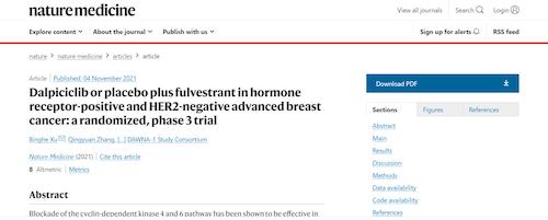 11月4日,国际四大医学期刊之一、英国《自然》旗下《自然医学》(Nature Medicine)在线发表CDK4/6抑制剂达尔西利(SHR6390)联合氟维司群治疗既往内分泌治疗后疾病进展的HR+/HER2-晚期乳腺癌的多中心、随机、双盲III期临床研究(DAWNA-1研究)中期分析结果报告,首次对氟维司群(雌激素受体降解剂)±达尔西利治疗激素受体阳性晚期乳腺癌的有效性和安全性进行了比较。研究结果显示,达尔西利+氟维司群组与安慰剂+氟维司群组相比,无进展生存期(PFS)显著延长。该项研究由中国医学科学院肿瘤医院徐兵河教授担任leading PI,全国39家医院参研,由利来国际w66医药临床研发团队支持完成。