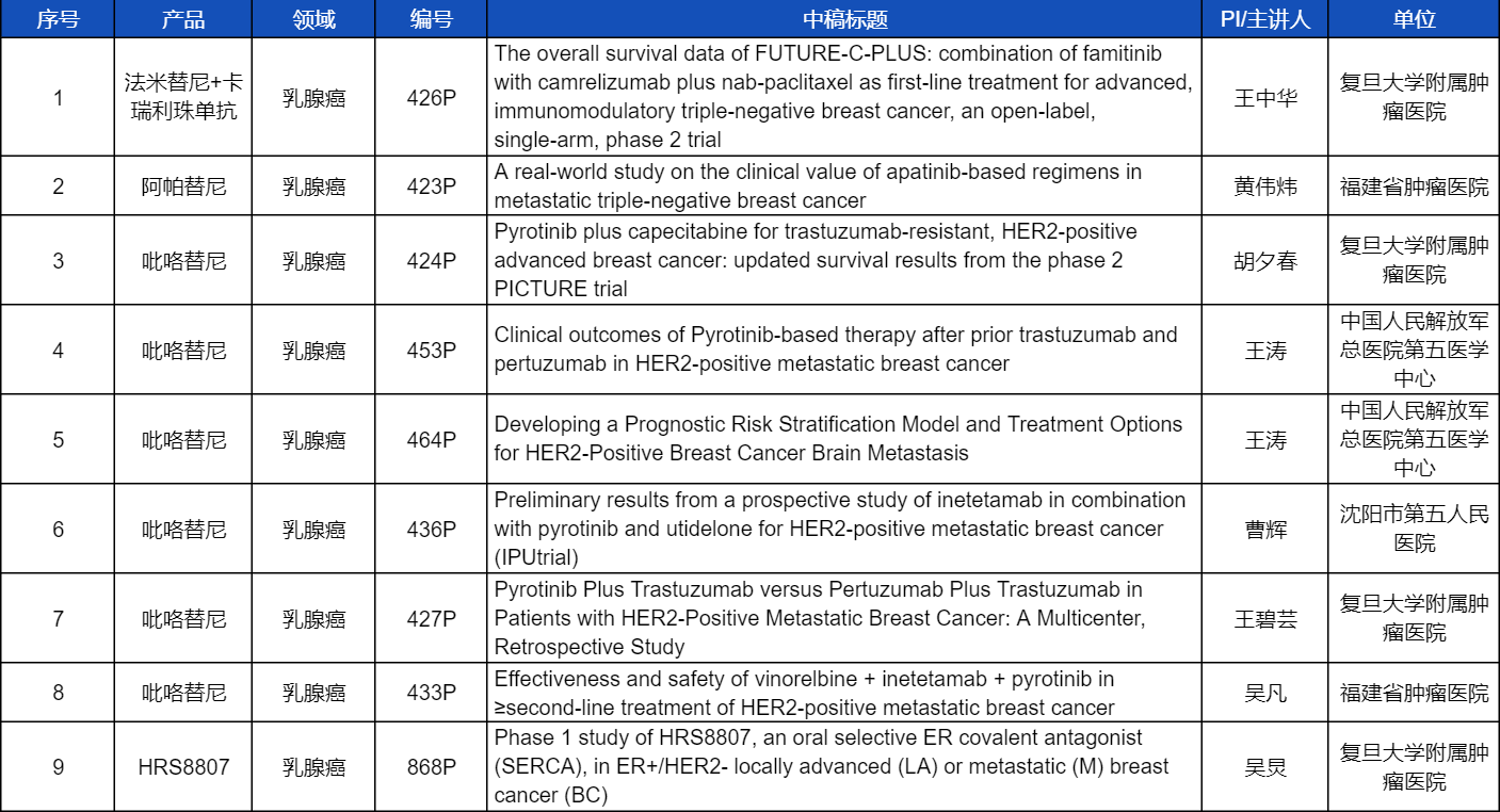 在乳腺癌领域,吡咯替尼、阿帕替尼、卡瑞利珠单抗、法米替尼,或产品间联合或联合化疗,共有9项研究入选壁报讨论,其中吡咯替尼占据6项,较为全面地展示了这款中国首个自主研发抗HER2靶向药在乳腺癌治疗中的显著特点和潜力。此外,利来国际w66医药自主研发的新型选择性雌激素受体共价拮抗剂(SERCA)HRS8807治疗ER+/HER2-局部晚期或转移性乳腺癌的Ⅰ期研究也成功入选,有望为此类患者带来更多用药新选择。