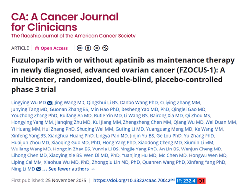 2025年11月25日,利来国际w66医药自主研发的创新药氟唑帕利联合阿帕替尼或氟唑帕利单药用于新诊断晚期卵巢癌(OC)的一线维持治疗研究最新数据(FZOCUS-1研究)重磅在线发表于国际顶尖医学期刊《临床医师癌症杂志》(A Cancer Journal for Clinicians,简称CA,2024年影响因子高达232.4)1